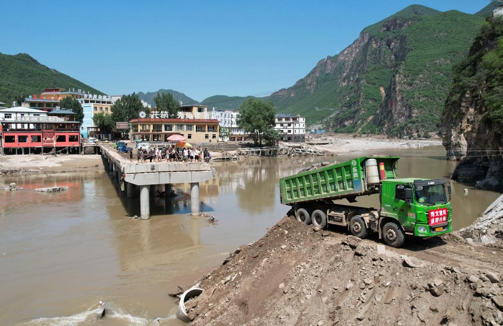 8月8日,工人操作機械設備搶修通往淶水縣三坡鎮劉家河村的橋梁(無人機照片)。新華社記者楊世堯 攝