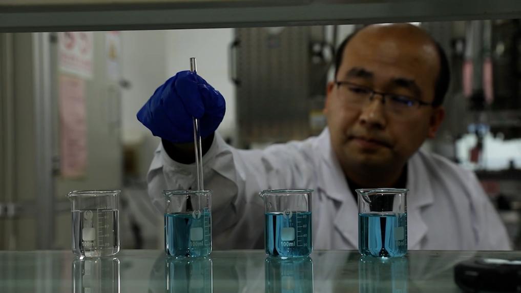 為證明療效,有店員現場做實驗:在一杯氫水和一杯自來水中,分別滴入“溶存水素濃度判定液”。約10秒后,自來水仍是藍色,氫水則變成無色。店員又把制氫機的輸氣管插入藍色自來水,1分鐘后自來水也恢復成無色。