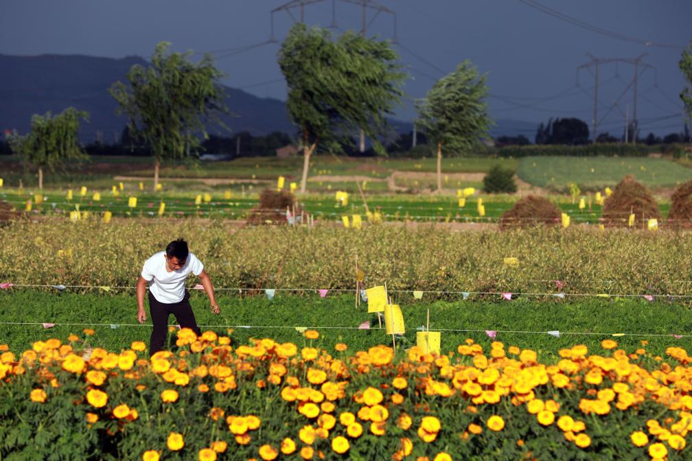 8月23日,甘肅隴西縣首陽鎮董家堡村38歲的農民閆百平正在自家中藥田里拔草。新華社記者程楠 攝