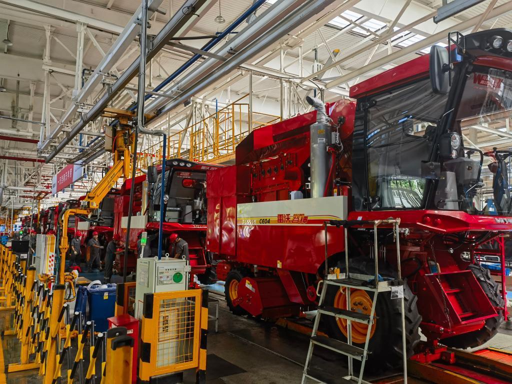 走進位于山東省濰坊市坊子區的濰柴雷沃智慧農業科技股份有限公司,拖拉機總裝二車間里機器轟鳴,工人們忙碌著將底盤、發動機、駕駛室等零部件組裝成整車,平均5分鐘就有一臺拖拉機下線。濰柴雷沃戰略總監田大永說,八九月份是秋收農機生產高峰期,公司各條生產線正滿負荷運轉,確保訂單按期交付。