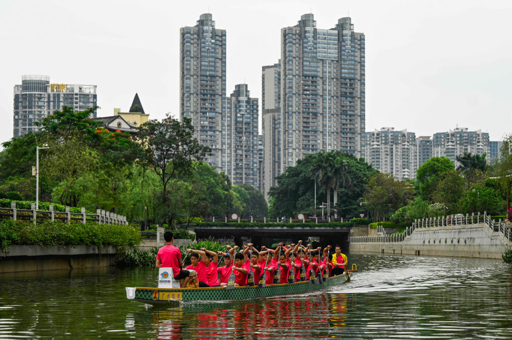 位于廣州CBD的獵德村村民進(jìn)行龍舟訓(xùn)練,備戰(zhàn)端午龍舟賽(2023年5月8日攝)。新華社記者 劉大偉 攝