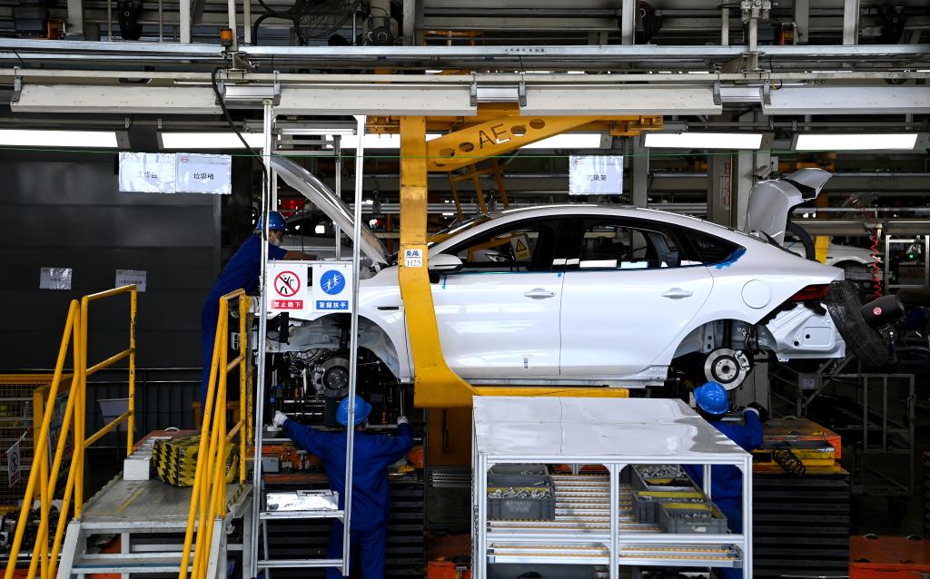 2022年4月20日,工作人員在西安比亞迪草堂工業園汽車總裝廠進行新能源汽車裝配。新華社記者 劉瀟 攝