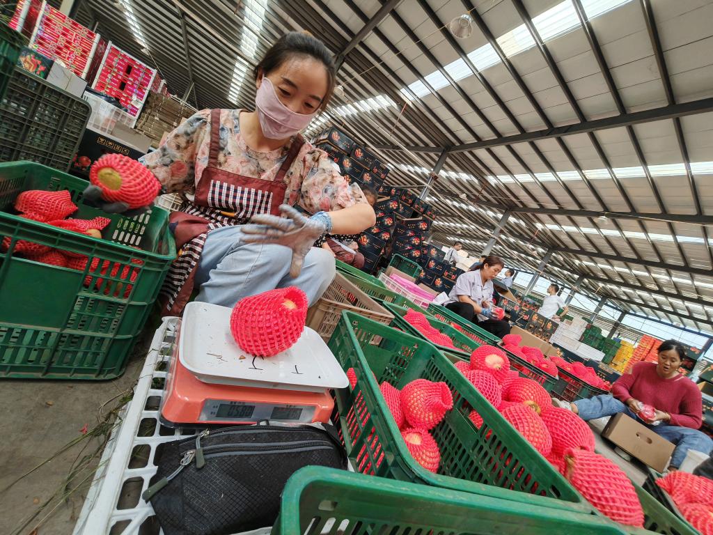 9月19日,會理市鹿廠鎮白草村農產品物流園區,務工人員正在分揀石榴果。新華社記者江毅 攝