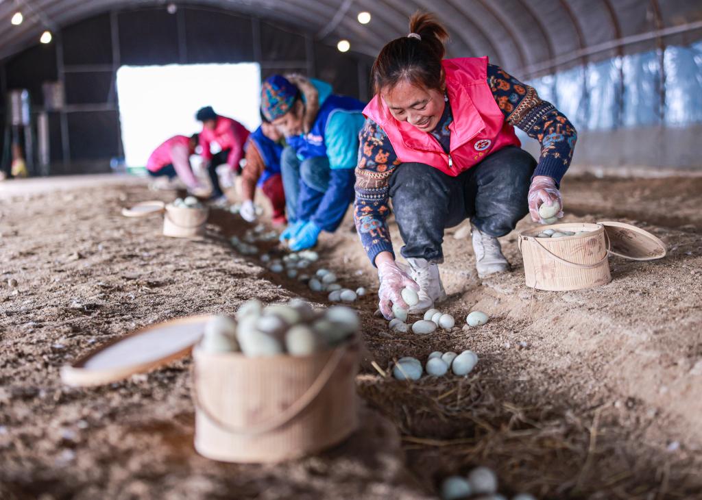 山東省榮成市夏莊鎮(zhèn)甲夼曲家村,李曉娜(前一)和村民們在收獲麻鴨蛋。新華社發(fā) 李信君攝