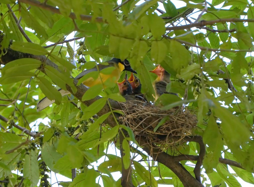 2023年6月28日,石門村內,三只藍冠噪鹛的幼鳥正在向親鳥乞食。(胡根旺 攝)
