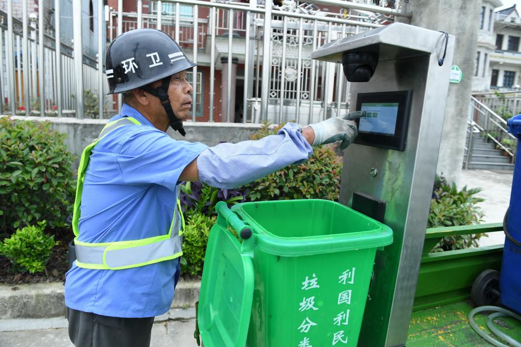 浙江省德清縣乾元鎮(zhèn)易腐垃圾清運(yùn)員使用垃圾分類(lèi)智能機(jī)器。新華社記者林善傳 攝