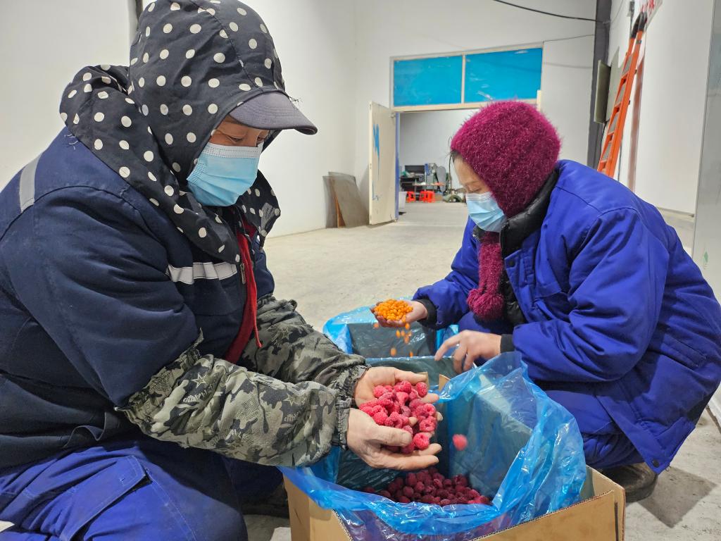黑龍江禾發農業科技有限公司工作人員在分揀紅樹莓和沙棘凍果。新華社記者張玥攝