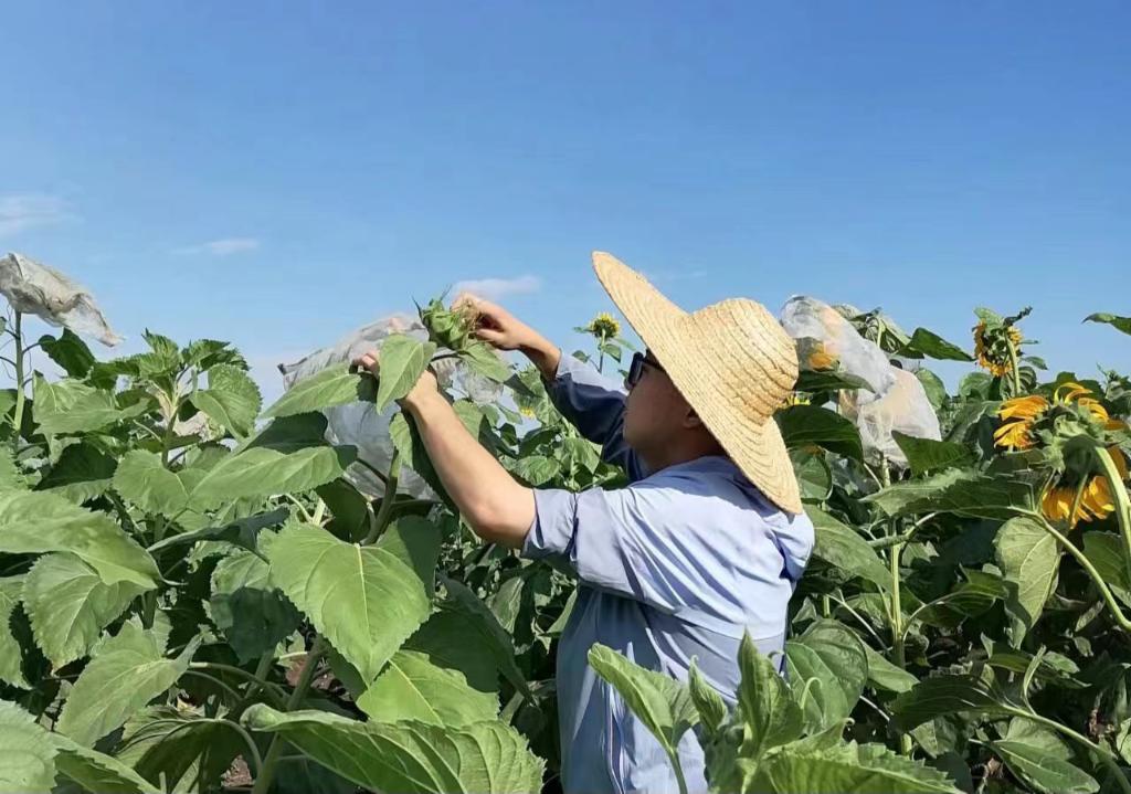 東北農業大學農學院研究生付國裕給試驗田里的向日葵套袋。(受訪者供圖)