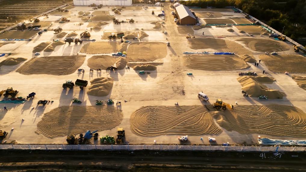在農家的場院、村屯、合作社、農場、糧庫,水稻、玉米、大豆堆積的一座座“糧山”,散發著豐收的色澤。
