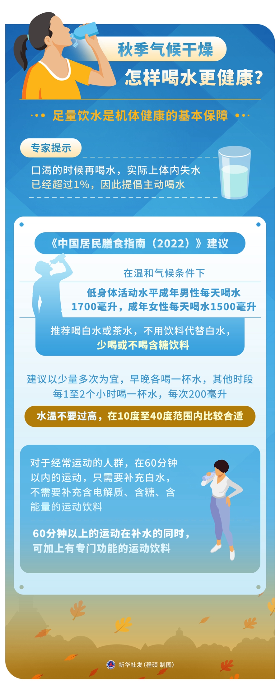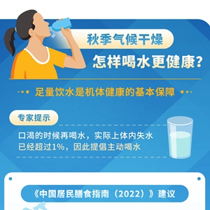秋季氣候干燥,如何科學(xué)足量飲水?專家提示,口渴的時候再喝水,實際上體內(nèi)失水已經(jīng)超過1%,因此提倡主動喝水。建議以少量多次為宜,水溫不要過高,在10度至40度范圍內(nèi)比較合適。