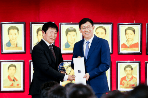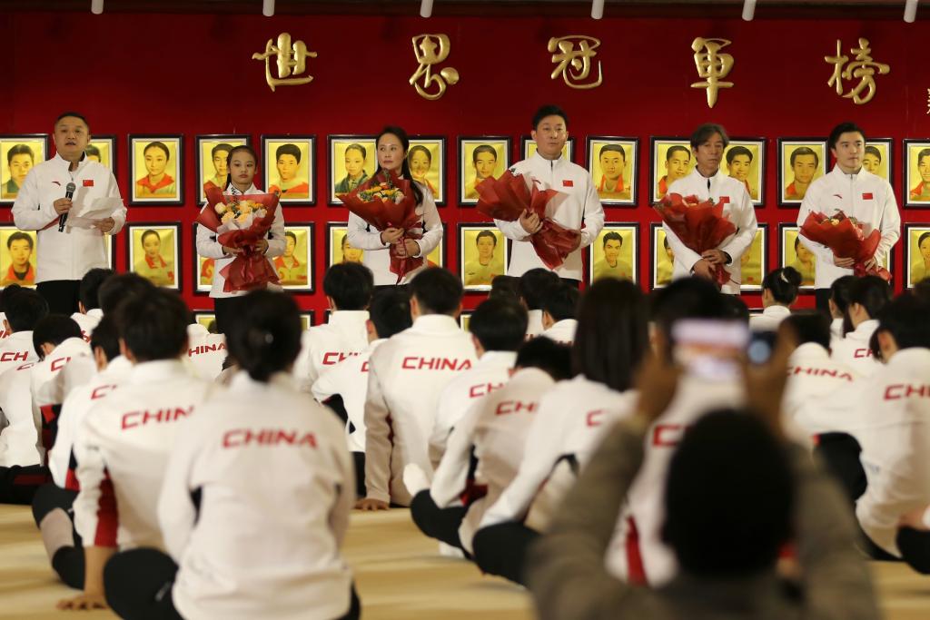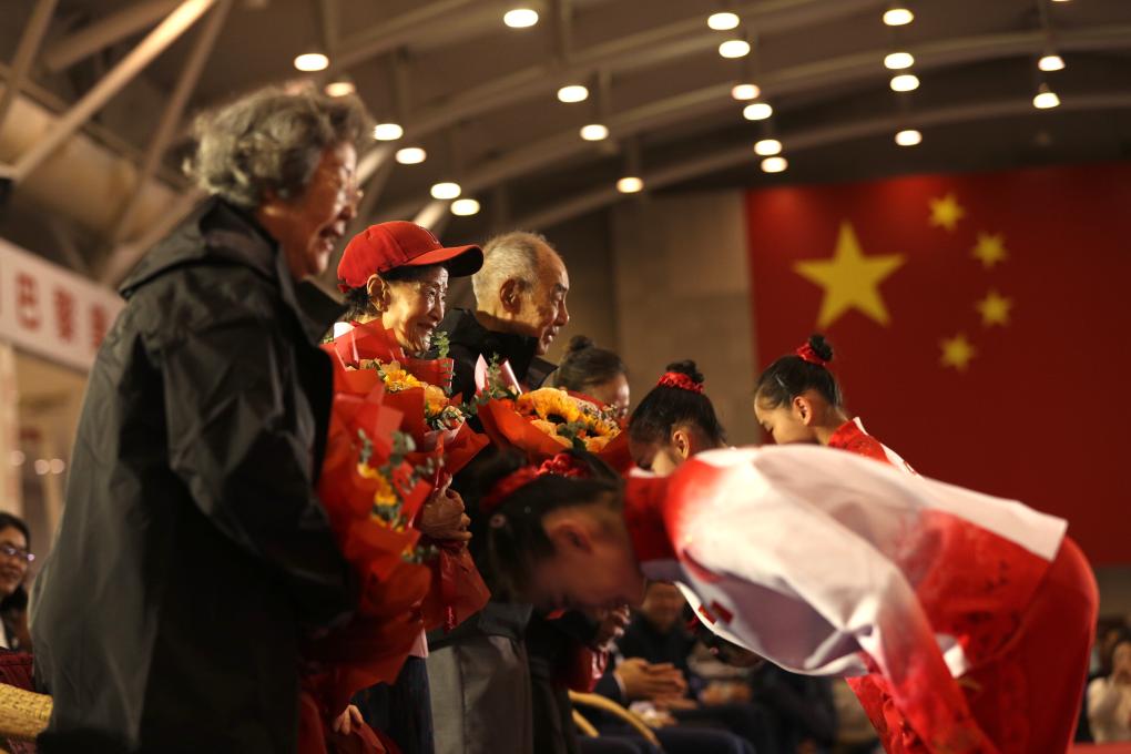 現(xiàn)役國家隊的小隊員向國家體操隊老前輩獻(xiàn)花