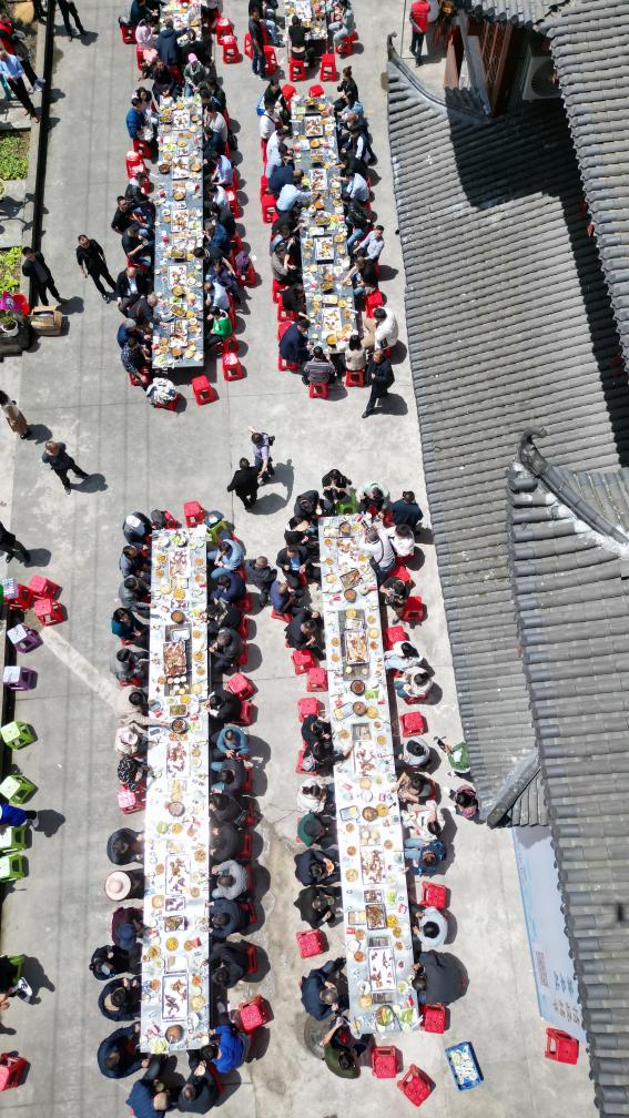 2023年10月4日,下坪燒烤節在湖北省恩施土家族苗族自治州鶴峰縣下坪鄉堰坪村舉行,游客在品嘗燒烤長桌宴。(張鵠 攝)