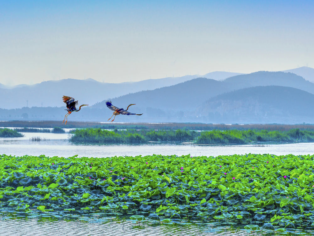 初冬時節,寒意漸濃。從湖邊望去,煙波浩渺的蔚藍湖面在陽光的照耀下泛著點點金光,一望過去竟有大海的廣闊之美。遠方的群山在霧靄中若隱若現,南遷候鳥陸續抵達。它們時而低頭覓食、嬉戲游弋,時而群起翱翔、引吭高歌。遮天蔽日的“鳥浪”,澎湃著生命的壯闊。
