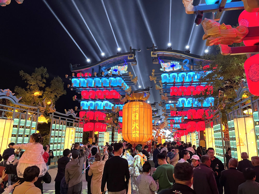 游客在大宋不夜城主街道“華燈錦里”游玩。
