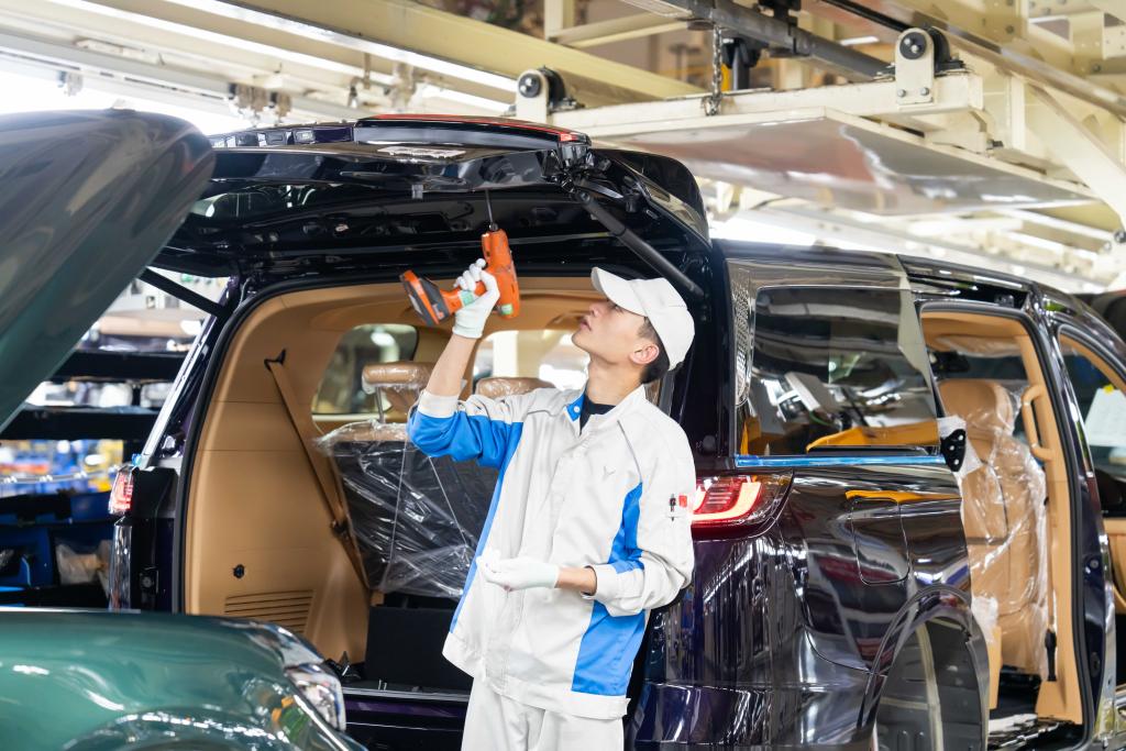 總裝車間內,工人正在安裝汽車后備箱。(侯毅超 攝)