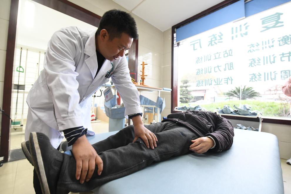 12月1日,在德陽市旌陽區孝泉鎮衛生院,醫生戚興林幫助譚少周進行下肢肌力訓練。新華社記者 唐文豪 攝