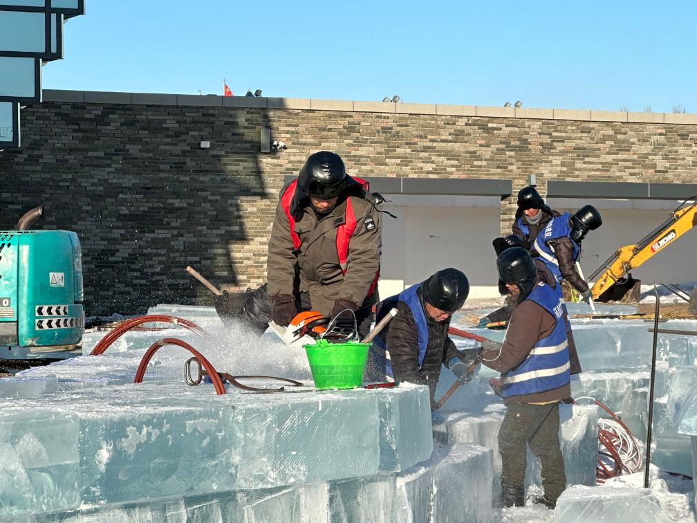 近日,在哈爾濱冰雪大世界建設(shè)現(xiàn)場(chǎng),工程車(chē)將一塊塊晶瑩剔透的冰磚鏟起,電鋸嗡鳴、冰屑飛舞之間,冰磚已被切割成合適的大小。不久后,這些冰磚將化為一座座冰雕,迎接各地游客的到來(lái)。