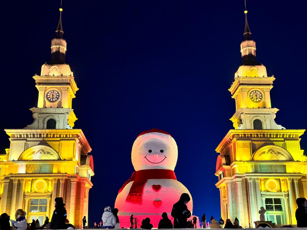 在道里區音樂長廊,約18米高的網紅大雪人頭戴紅帽子,扎著紅圍巾,笑盈盈地和人們“問好”,吸引眾多市民與游客參觀。每年冬天,網紅大雪人都為哈爾濱增添一份浪漫與童趣。