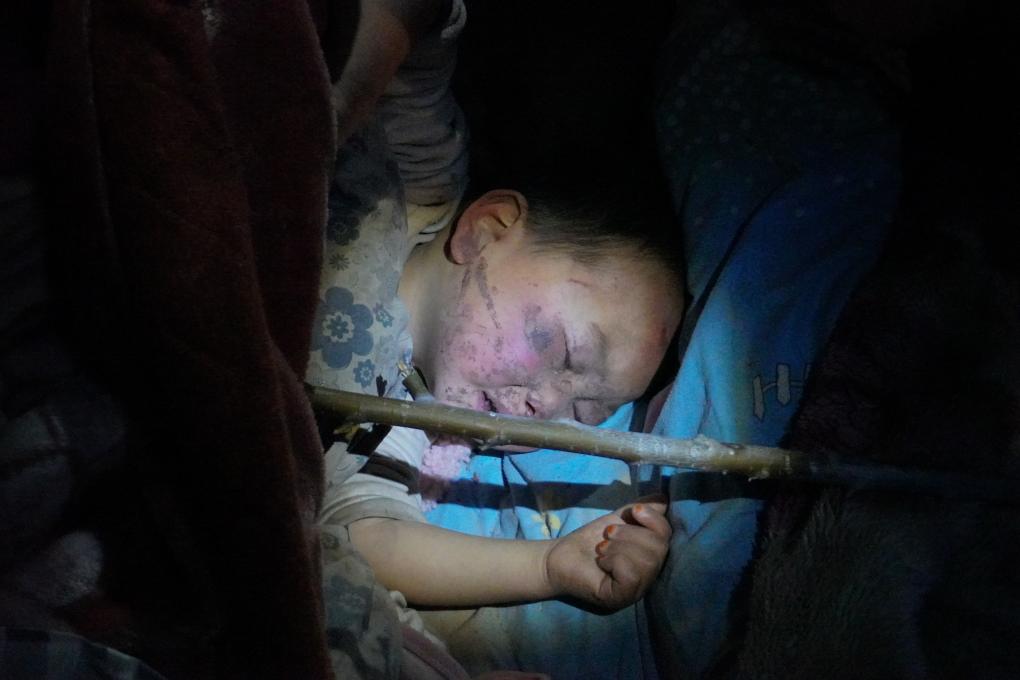 12月19日,在甘肅省臨夏回族自治州積石山保安族東鄉族撒拉族自治縣積石山縣中西醫結合醫院門口,一名受傷兒童得到安置和初步診療后熟睡。新華社記者 馬希平 攝