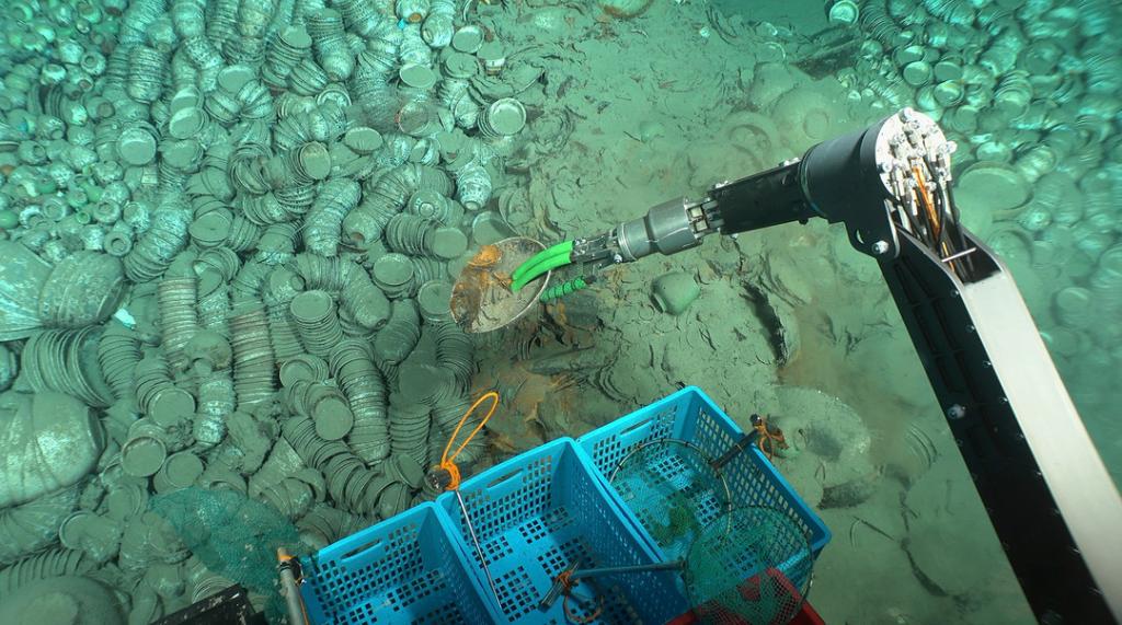 文物工作者使用深潜设备对南海陆坡沉船遗址水下文物进行提取。新华社发