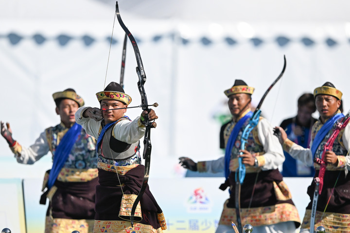 2024年11月27日,第十二届全国少数民族传统体育运动会表演项目中,西藏队选手表演《响箭》。新华社记者 孙凡越 摄