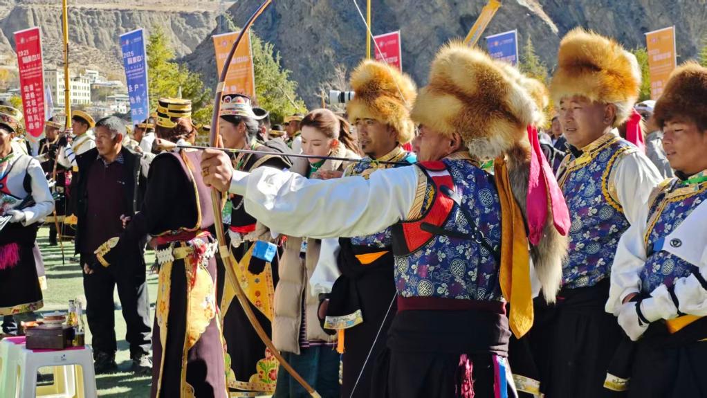西藏自治区林芝响箭比赛已连续举办十届,是西藏规模最大、影响最广泛的响箭比赛之一。比赛前,村民们身着盛装、携酒备肴,早早就来到赛场等待。比赛过程中,人们唱起旋律激昂、提振士气的箭歌,跳起“工布箭舞”,射中箭靶后,射手们还会与队友击掌相庆,呼喊“擦秀”(藏语“庆祝”之意)以示鼓励,现场氛围好不热闹。