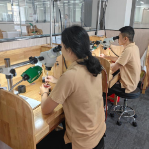 在位于三亚的海南海润珍珠股份有限公司,车间内柔和的专业灯光下,工匠们凝神屏息,借助显微镜,用精细镊子将珠宝稳稳嵌入雕花珠托。