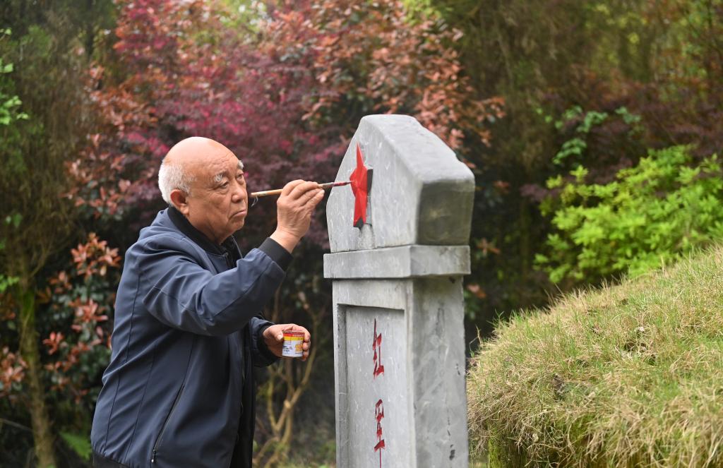 4月2日,在广西全州县米花山红军烈士墓,蒋石林老人在给红军烈士墓碑描红。