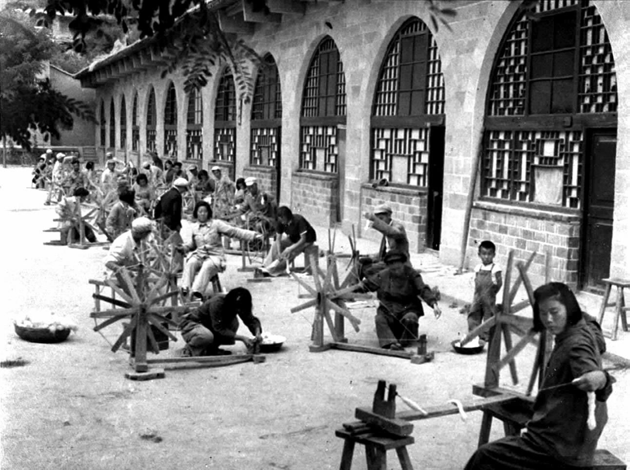 ▲延安机关干部在窑洞前摇车纺线。新华社发