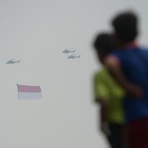 8月17日,人們注視著懸掛印度尼西亞國旗的直升機飛過雅加達上空。8月17日是印度尼西亞獨立日。新華社發(祖卡南攝)