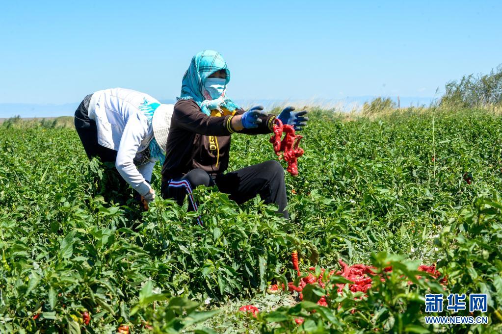 近日,新疆巴里坤哈薩克自治縣三塘湖鎮迎來辣椒豐收季,村民們搶抓晴好天氣采摘、晾曬辣椒。