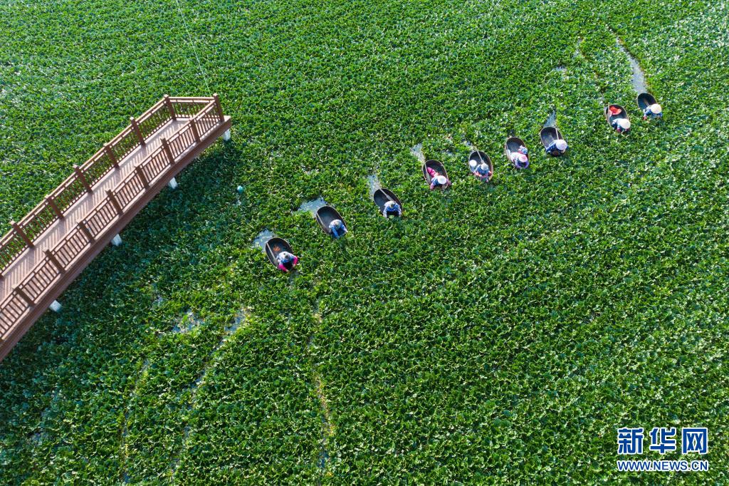 8月19日,在浙江省嘉興市秀洲區油車港鎮西千畝蕩,菱農們坐著水鄉特有的菱桶采摘成熟的菱角(無人機照片)。