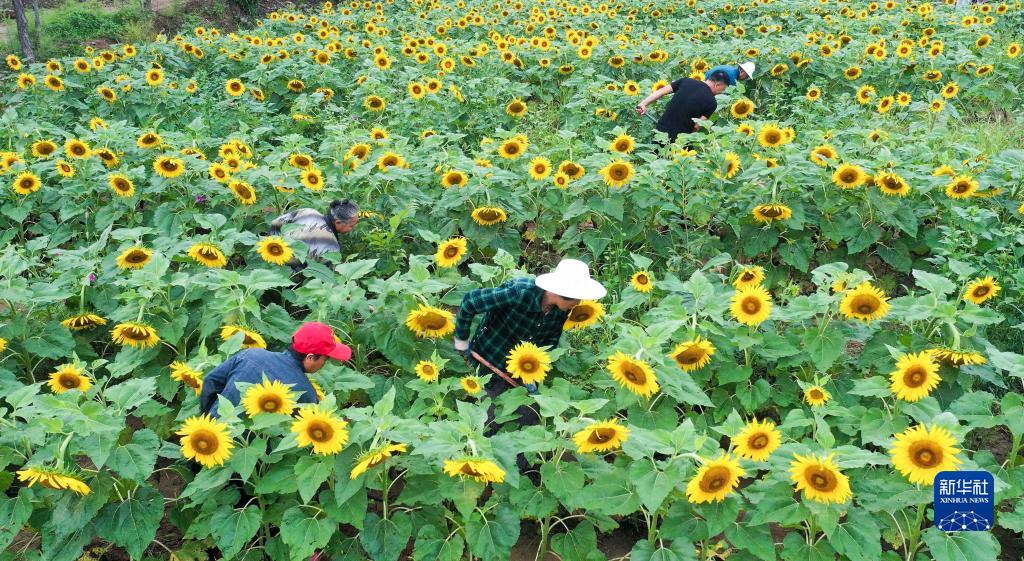 8月23日,河北省唐山遵化市建明鎮(zhèn)鴻鴨屯村的農(nóng)民在向日葵田間鋤草(無人機照片)。