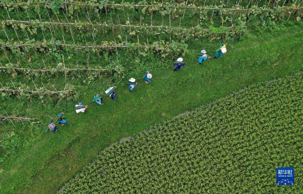 8月23日,村民在貴州省黔東南苗族侗族自治州丹寨縣揚武鎮羊排村冬瓜種植基地采收冬瓜(無人機照片)。