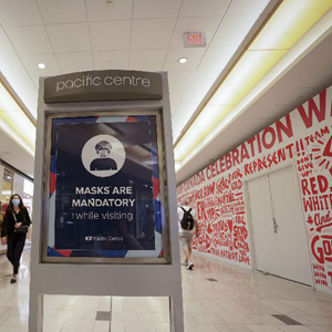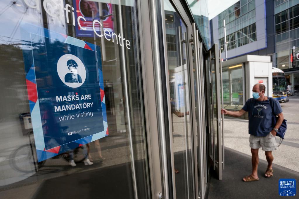 8月25日,在加拿大不列顛哥倫比亞省溫哥華,商場門外貼著須戴口罩進入的告示。