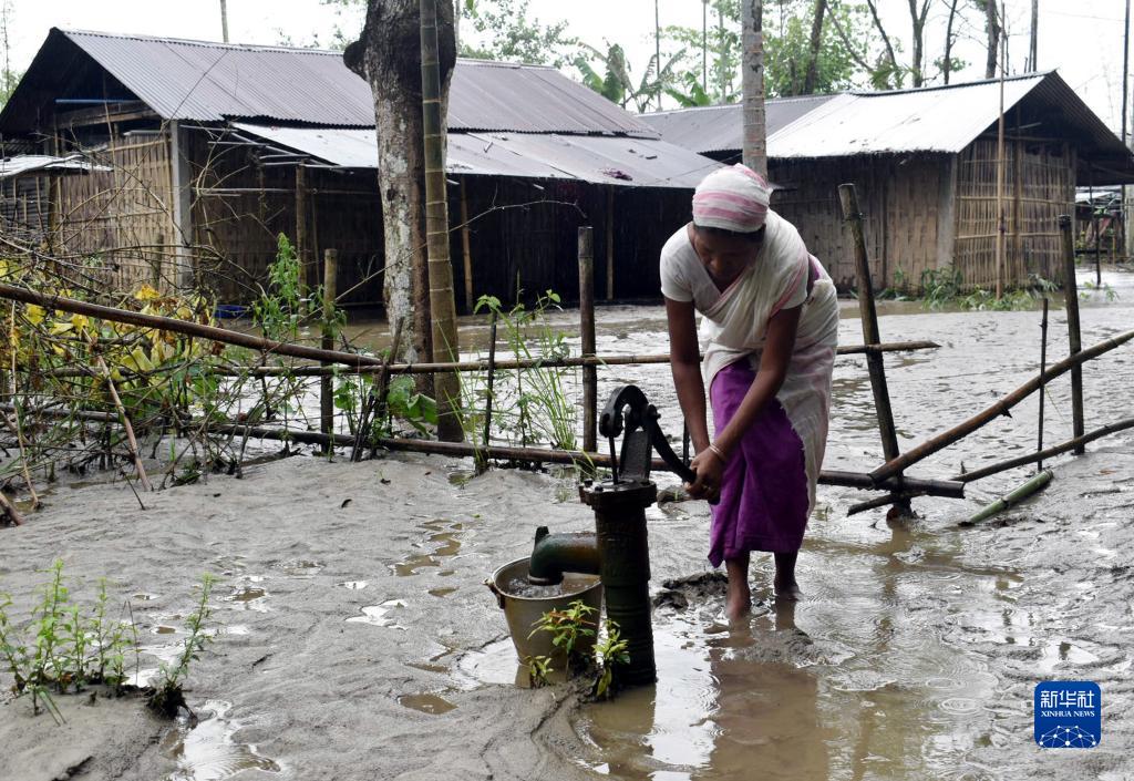 8月28日,在印度阿薩姆邦,一名女子在一處幾乎被淤泥覆蓋的水井旁打水。