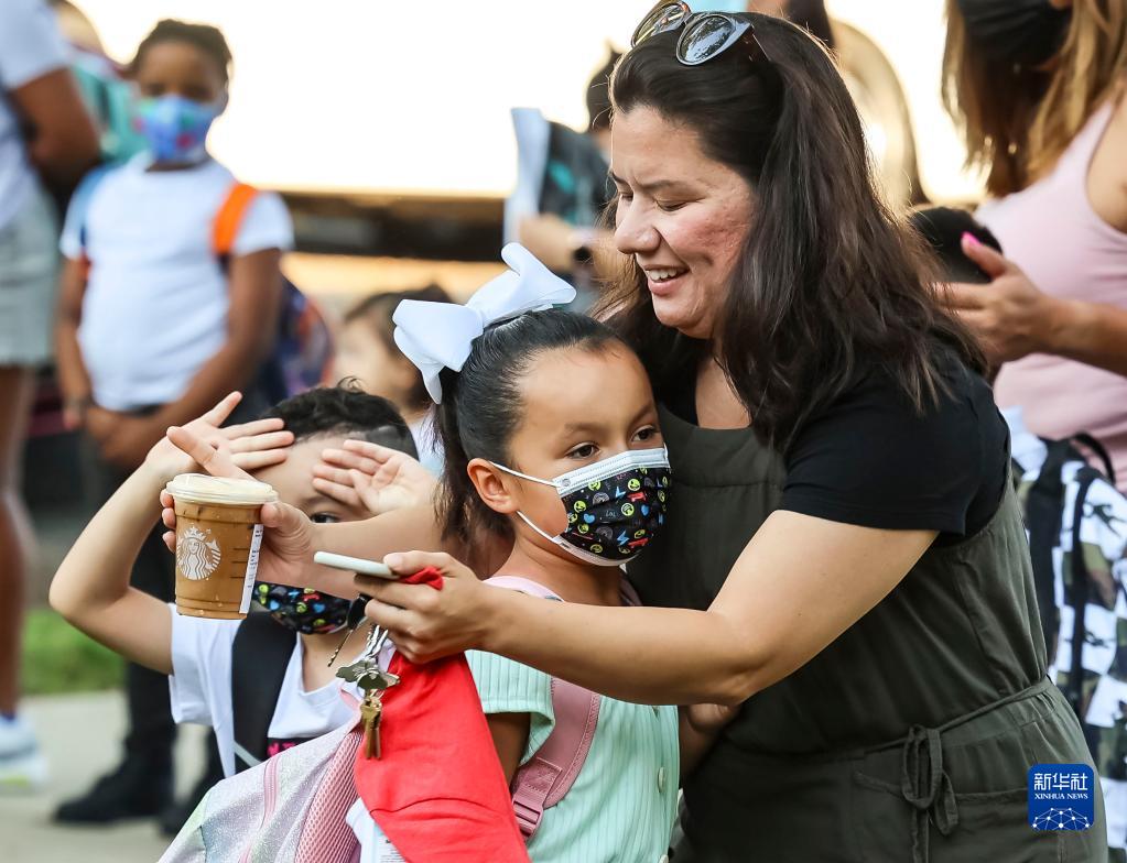8月30日,在美國芝加哥,家長在開學日送孩子上學。