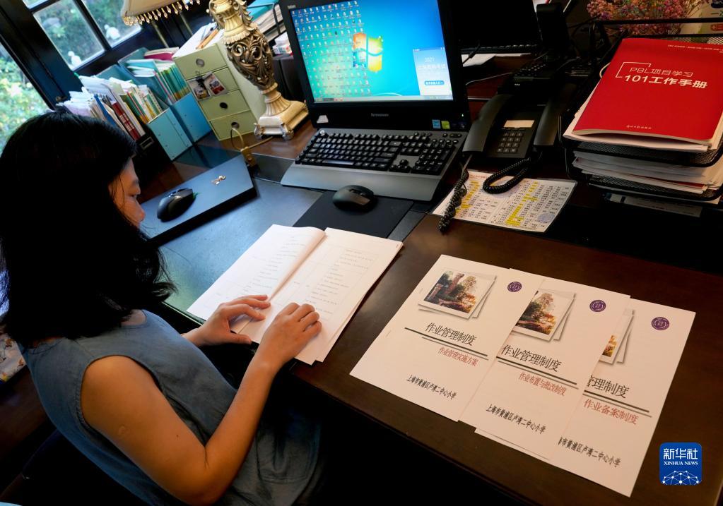 這是9月1日在上海市黃浦區(qū)盧灣二中心小學(xué)教師辦公室內(nèi)拍攝的新學(xué)期作業(yè)管理要求和制度。這是學(xué)校根據(jù)“雙減”政策及相關(guān)規(guī)定重新修訂的,要求老師嚴(yán)格執(zhí)行。
