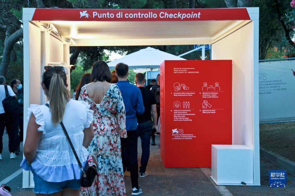 9月1日,在意大利威尼斯利多島,人們排隊進入第78屆威尼斯國際電影節現場。