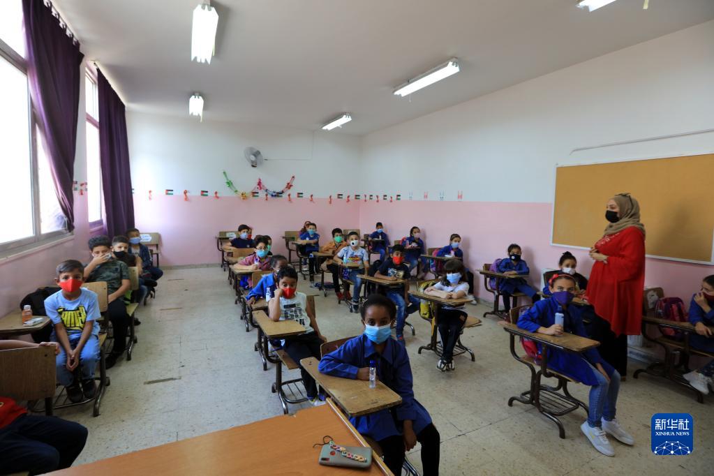 9月1日新學(xué)年第一天,約旦安曼一所學(xué)校的學(xué)生們戴著口罩上課。