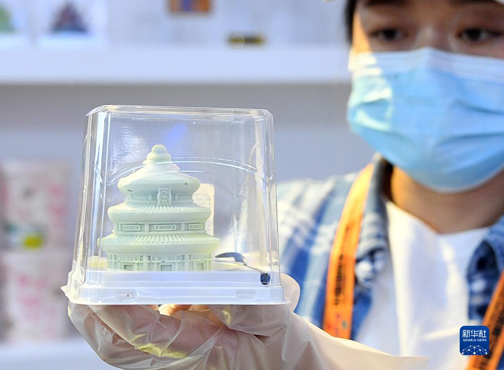 9月5日,工作人員在服貿(mào)會(huì)首鋼園區(qū)文旅服務(wù)展館展示天壇慕斯雪糕。