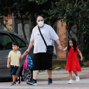 9月8日,一名家長(zhǎng)在西班牙馬德里送孩子上學(xué)。