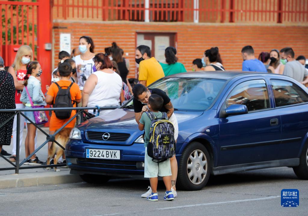 9月8日,一名家長在西班牙馬德里的一所學校外與孩子告別。