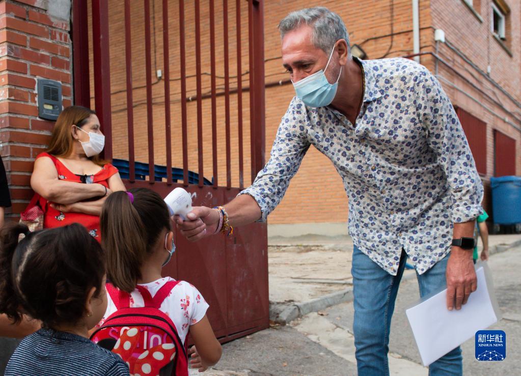 9月8日,一名老師在西班牙馬德里一所學(xué)校外為學(xué)生測(cè)量體溫。