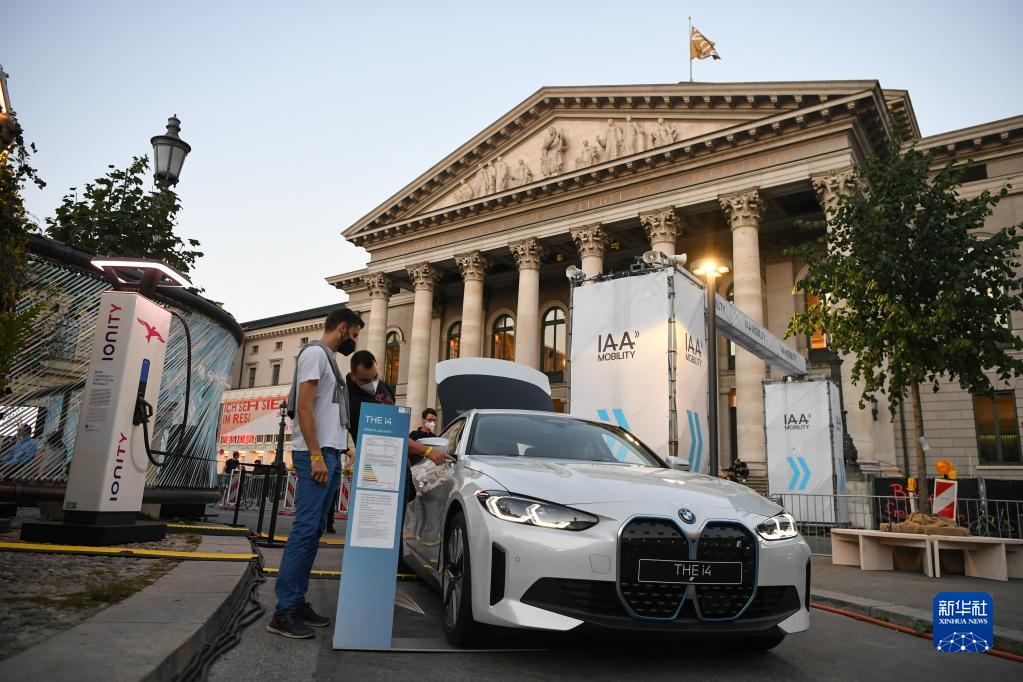 9月8日,人們在德國慕尼黑國際車展寶馬汽車戶外展區參觀一臺i4電動汽車。