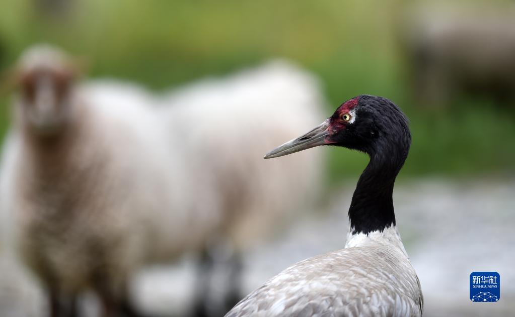 9月8日,黑頸鶴站在羊群中。