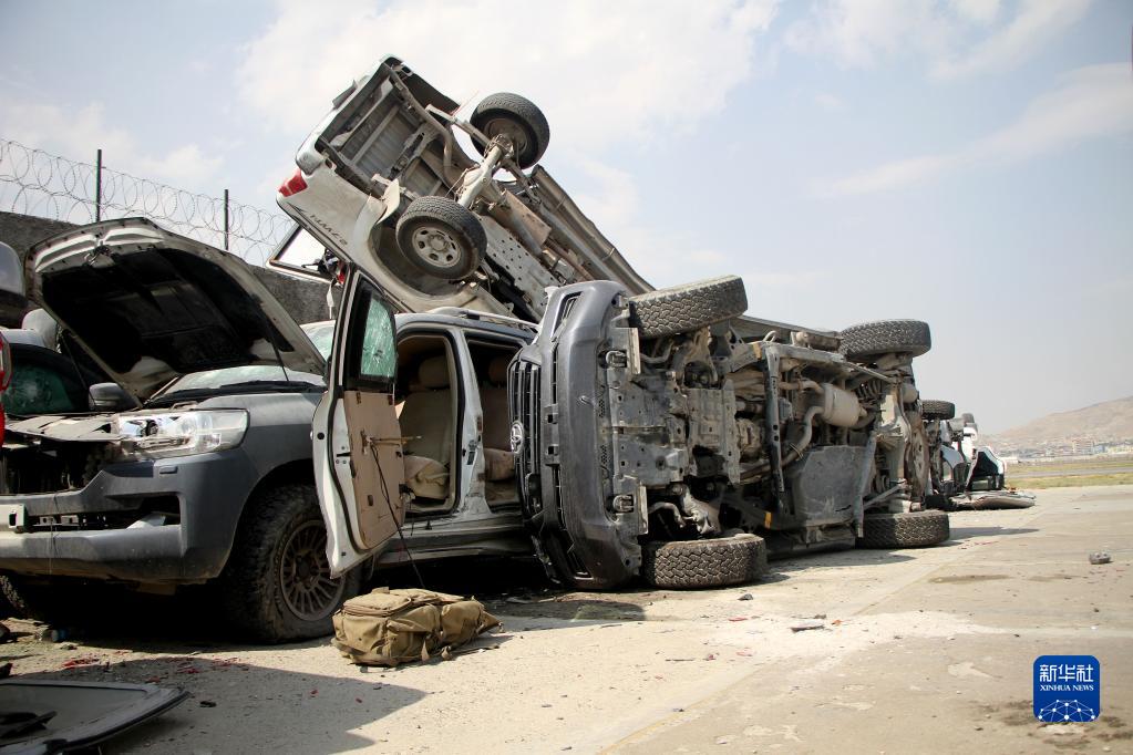 這是9月20日在阿富汗喀布爾機場拍攝的損毀的汽車。