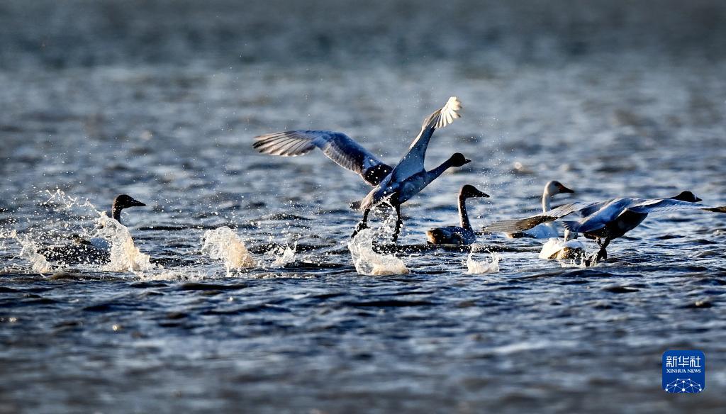 近日,陜西省榆林市榆陽(yáng)區(qū)河口水庫(kù)濕地迎來(lái)大批白天鵝、赤麻鴨等鳥(niǎo)類(lèi)。近年來(lái),位于毛烏素沙地南緣的榆陽(yáng)區(qū)采取退牧還濕、禁牧減畜等有效措施,加強(qiáng)生態(tài)環(huán)境保護(hù)。河口水庫(kù)濕地?fù)碛写罅繙\灘、蘆葦,地勢(shì)平緩,水域?qū)拸V,野生魚(yú)蝦資源豐富,已經(jīng)成為越冬候鳥(niǎo)途中覓食、停歇的理想之地。