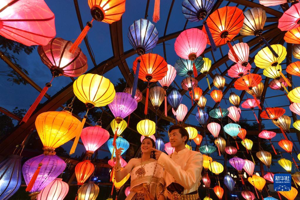 11月8日,游客在泰國北欖府舉行的國際燈籠美食節預展活動上觀賞燈籠。
