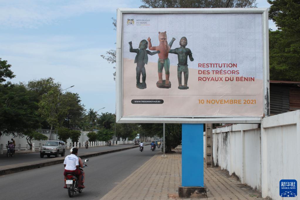 這是11月10日在貝寧科托努街頭拍攝的慶祝文物回歸的海報(bào)。